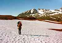 I bakgrunden en av Akka-massivets glaciärer. Avståndet till Akka är cirka en mil.
