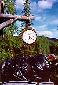 Jag glömde att "kalibrera" vågen. Jag tror att nålen stod på 5 kg. På bilden visar den 35 kg. Troligtvis var det runt 30 kg före omfördelningen. Kerstin fick ta lite mer mat. 25 kg för en storväxt människa är inget problem, bara ryggsäcken är bra och det var min.