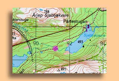 Vi närmar oss Pårtestugan. Där stigen lämnar den stora sjön Stour-Tata, till vänster på kartan, träffade vi ett gäng norrmän som hade gått 3 mil. De satt alldeles vid strandkanten och lagade mat.