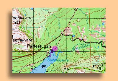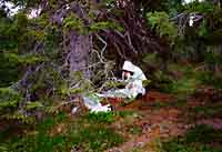 Vi har lämnat Pårtestugan. Nu regnar det och det är dags för lunch. Det funkar faktiskt ganska bra att sitta under en tät gran. Myggen tycker också det är ett bra ställe.
