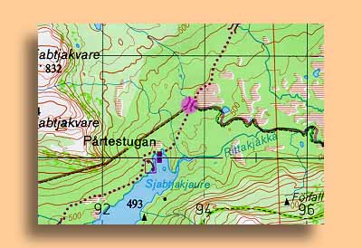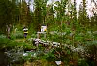 Nu är vi på gränsen till Sarek, vårt mål. Tavlan på bilden skvallrar om att vi går in i nationalparken. Kungsleden snuddar Sarek i underkanten cirka 10 kilometer.