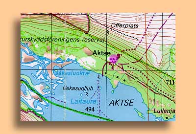 Aktsestugan ligger fint på en sluttning ner mot sjön Laitaure. I den här stugan kan man också köpa proviant. Bakom stugan ligger "mördarbacken". Egentligen är backen inte så farlig men om man på morgonen startar för att gå norrut så blir man snabbt varm i kläderna. På cirka 500 meter stiger det 150 meter. Det låter inte så mycket men börjar man dagen med detta så tycker man det. |