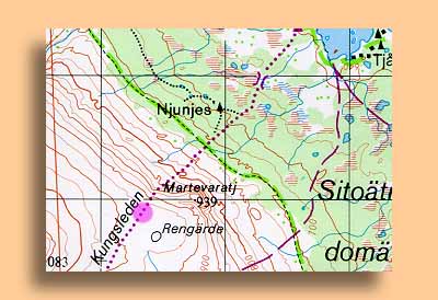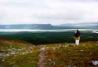 Det vi ser framför oss norröver, är Sitojaure. Ännu längre bort i diset finns vårt slutmål, Saltoluokta. Vi är på väg nerför till den glesa björkskogen. Vandringen över den kala puckeln har varit härlig. Hela tiden har vi haft mörka regnmoln bakom oss. Terrängen här är ytterst lättgången, ganska plant och inga stenar.