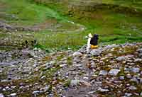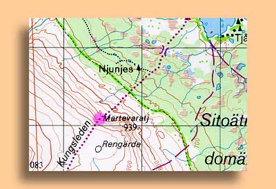 Vi närmar oss sjön Sitojaure. Eftersom vi går på Kungsleden så träffar vi folk (små gröna prickar till vänster i bild) hela tiden. Nja, inte hela tiden kanske. Det är ju inte som i Sarek där man kan gå utan att träffa någon. Vi är på väg nedför sista branten innan Sitojaure. En bit till och det är helt plant och mer växtlighet.