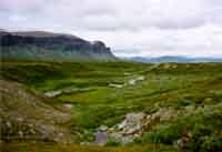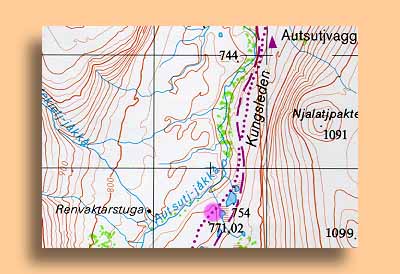 Den här biten av Kungsleden är härlig. Vi går i en dalgång på cirka 700 meters höjd och är omgivna av toppar på 1250 respektive 1100 meter. Terrängen är mycket lättgången. Vi börjar närma oss vårt slutmål för denna dag och det är kåtan, se överst på kartan.