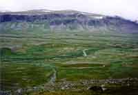 På den här bilden är kameran vriden något. Nu pekar den rakt mot väster. Berget framför oss är Sjäksjo. Fortfarande är kåtan långt där nere som en liten prick.